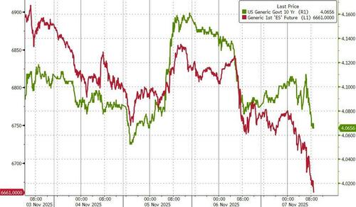 De-Risking is back on the table as Nomura MD Charlie McElligott points out that (for a change), bonds are trying to work like "Risk Hedges" again, with USTs seeing a bull-steepening on further "Risk-Off" (Equities and Crypto with “real” struggle-sessions the entire month of November at this point), after Labor data this week - from Revelio (and its LinkedIn inputs, Caveat Emptor) indicating Oct Jobs would be about -9k along with downward revisions, alongside the earlier Challenger Job Cuts release showing the highest Oct print in 20 years @ ~ 150k cuts - got folks a bit uncomfortable…