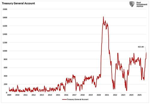While that may sound frightening, there is a twist. If the Fed steps in to relieve repo pressure, like it did in 2019, it might trigger the opposite of a crash. In other words, the Fed’s actions to stabilize the repo market may lead to a “melt-up” in equities, where risk assets surge, not because fundamentals improve, but because liquidity returns in force. Such a conclusion is not far-fetched, as the Government shutdown has drained over $700 billion from the market, as shown by the sharp increase in the Treasury General Account.