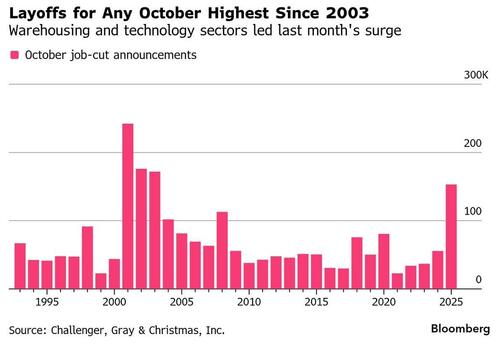 Treasuries rebounded after the latest Challenger job cuts jumped to over 150K in October, nearly triple the year-earlier period and the most for the month in more than two decades. YTD job cuts have exceeded 1M, the most since the pandemic. The yield on 10-year notes fell two basis points to 4.14%, while the dollar headed for its biggest drop in three weeks.