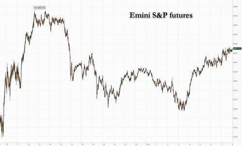 US equity futures are higher, rebounding from session lows for the second day in a row, amid headlines that layoffs are surging due to AI which in turn is raising odds of a Dec rate cut, with JPM saying that "the market is weighing a weaker labor market and potential spending vs. evidence on the efficacy (and ROI) of AI plus productivity gains." Challenger job cuts jumped to over 150K in October, nearly triple the year-earlier period and the most in more than two decades. As of 8:00am ET, S&P futures are 0.2% higher ahead of the last major earnings day of a season that’s delivered stellar results; Nasdaq futures are also up 0.2%, with Semis catching a bid driven by MRVL (+11%, takeover chatter) and NVDA (up +1.4% after yesterday’s roll on the OpenAI govt backstop headlines). TSLA rose 0.5% ahead of a vote on granting Elon Musk a potential $1 trillion pay package. In the premarket, cyclicals look flat to Defensives, while commodity-related plays are bid. The commodity complex is higher led by Energy and Metals. Asia closed higher (Shanghai +97bps/Hang Seng +2.12%/Nikkei +1.34%) driven by strength in growth/tech/ai names, while Europe is down small (FTSE -25bps/DAX -10bps/CAC -45bps). US 10 year yield down small at 4.13% on quiet macro news as the curve bull steepens, and the USD is weaker. The macro data focus is on Challenger Job Cuts which soared to 153,074K, the highest for October since 20023, and state-level initial jobless claims. Today also brings another heavy dose of earnings (pre-open we get APD, BDX, CMI, COP, H, PENN, PH, RL, ROK, TPR...post-close we get AKAM, CE, EXPE, MCHP, SNDK, TTWO, WYNN), a handful of Fed speakers, the BOE rate decision and TSLA’s annual meeting (which includes voting on Musk’s pay package). Markets also digest the likelihood of the Supreme Court striking down Trump’s IEEPA tariffs after oral arguments yesterday (Goldman expects a ruling in Dec of Jan ’26 // GIR full take).