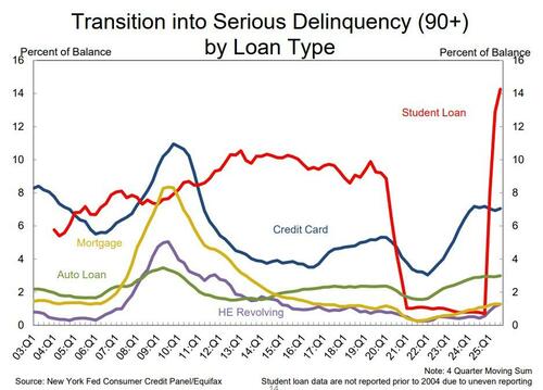 Taking a closer look at the ground zero of the current consumption crisis, namely student Loans, where outstanding debt stood at $1.65 trillion in Q3 2025.
