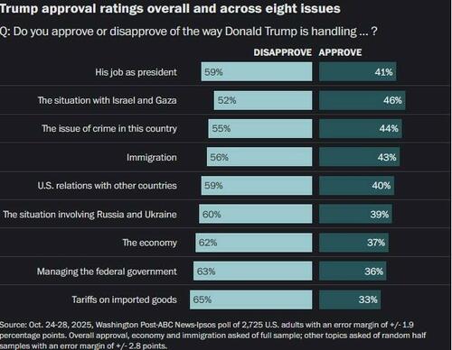 Meanwhile President Donald Trump’s approval rating continues to weigh heavily on Republicans. A Washington Post–ABC News–Ipsos poll found that 41% of Americans approve of his handling of the presidency, compared with 59% who disapprove. Among independents, only 30% approve, while 69% disapprove. On the economy - long seen as Trump’s strongest issue - he fares worse, with 37% approving and 62% disapproving. “These Trump economic numbers are in line with other recent polls,” one report noted. “This is a serious problem for Republicans.”