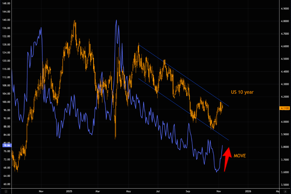 Bond volatility had been easing steadily since the Liberation Day chaos, but the MOVE index has spiked sharply in recent sessions, marking the largest consecutive surge in bond volatility since the “great reset” began.