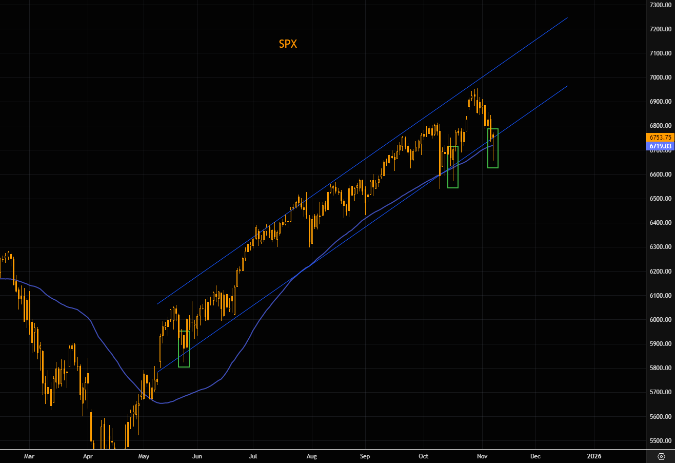 Friday was a dynamic one, huge hammer candles across the board. The SPX chart shows it clearly, right on the trend channel lows and the 50-day. Hammer candles like this, especially after drawdowns, often signal reversals. Look back at the previous hammers since the May bull began.