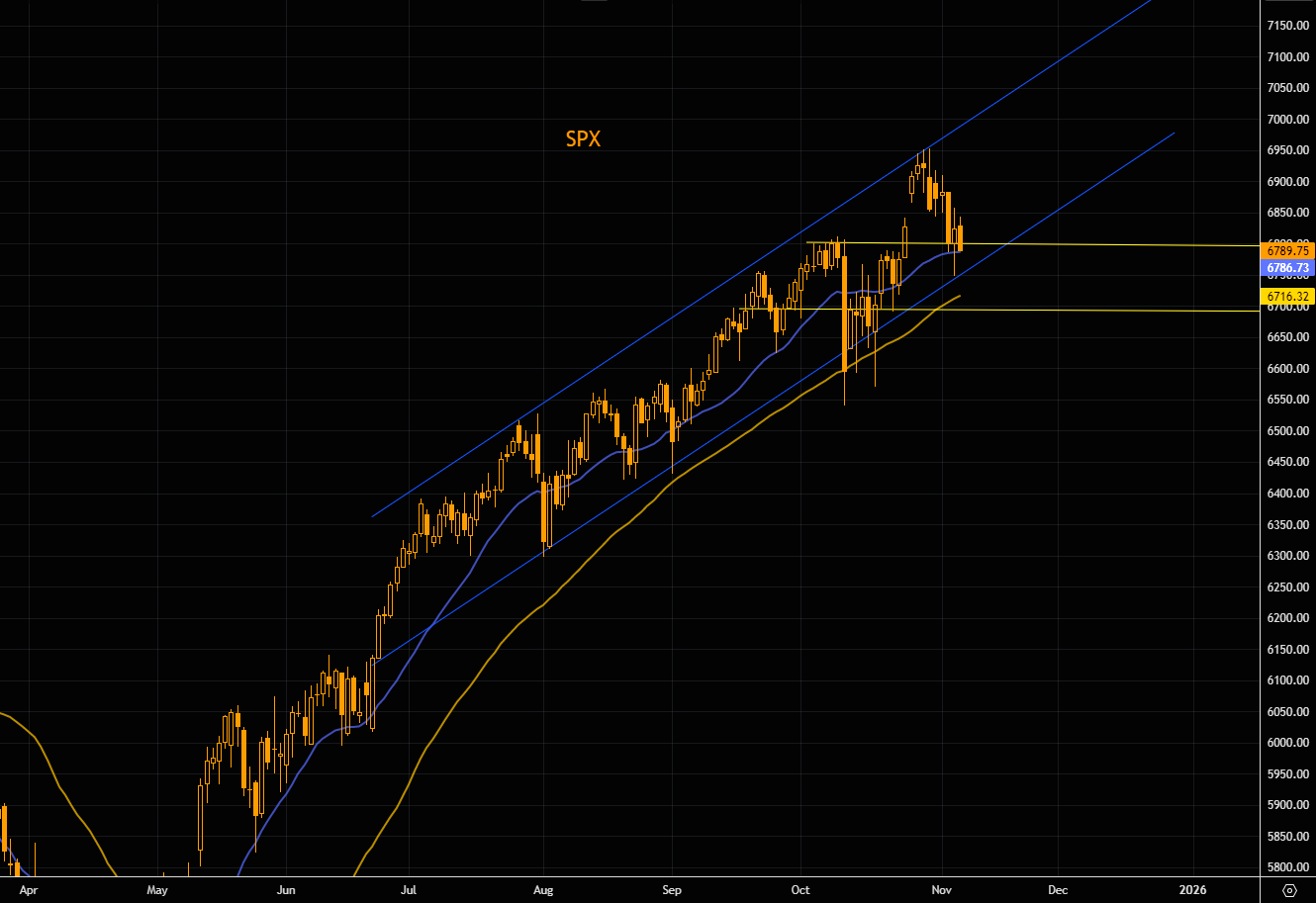 SPX futures below the big 6800 level (futures) as of writing, hitting the 21 day right here. Trend channel lows slightly lower, followed by the 50 day and the big 6700 support. Note we have retraced the entire break out move from late October. Not great...