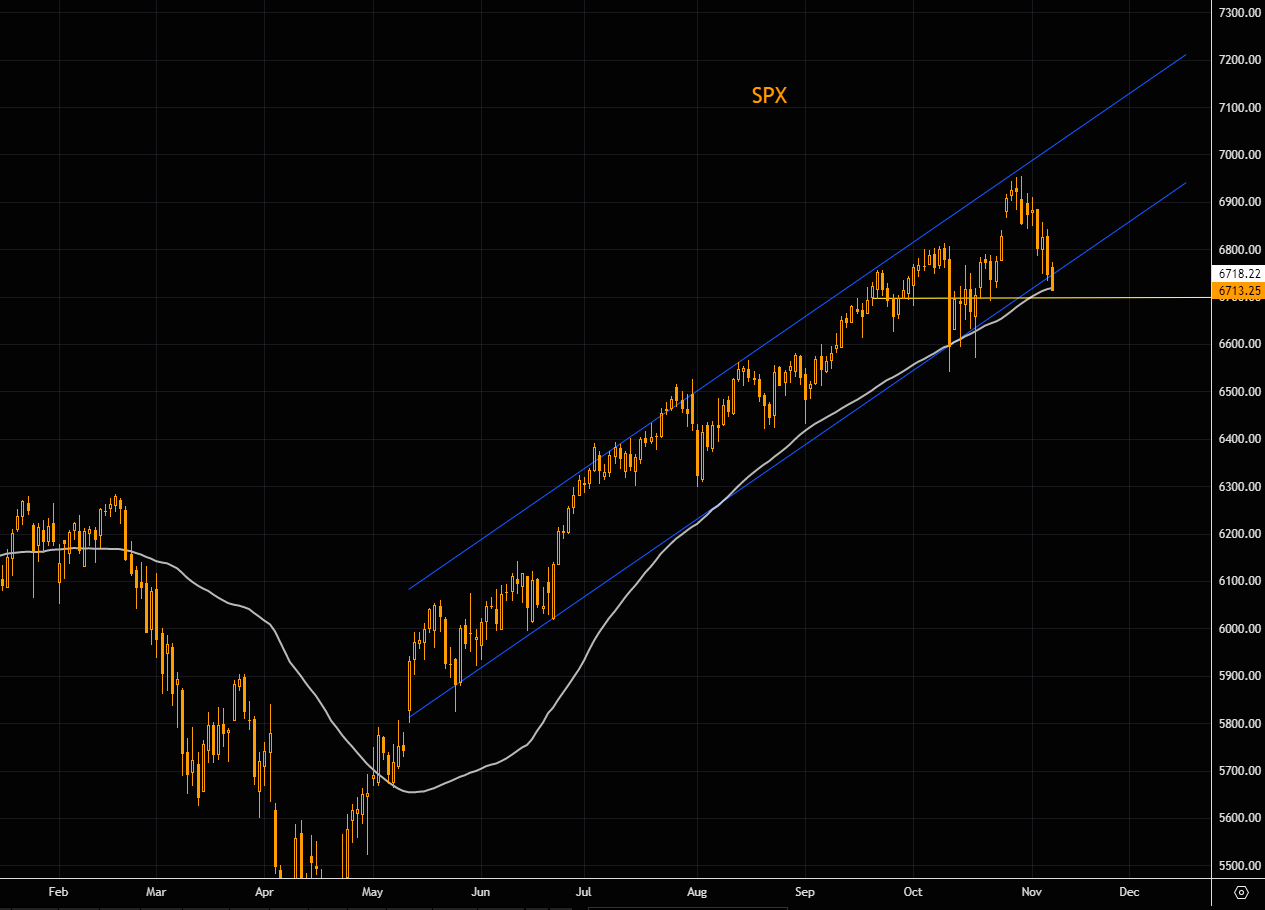 SPX futures trading just below the 50 day as of writing. Note we haven't closed below the 50 day since the May melt up started. Lower part of the trend channel comes in here as well. A close below 6700 and things risk becoming "real" ugly...