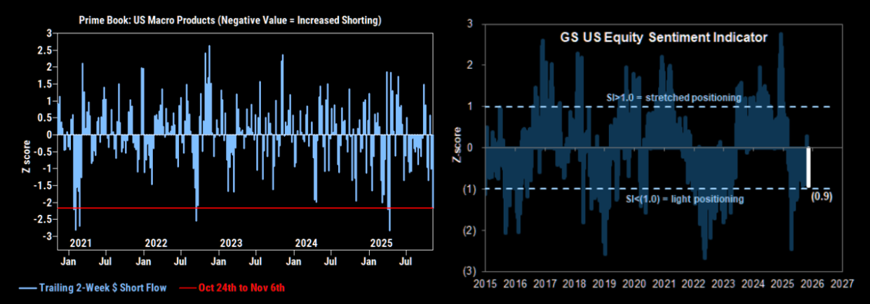Positioning has shifted sharply. Over the past two weeks, shorts have built up to some of the largest levels seen in years, comparable to April 2024, Q3 2022, and Q1 2021. As a result, Goldman's Sentiment Indicator, has dropped to a five-month low, edging back toward “light” territory.